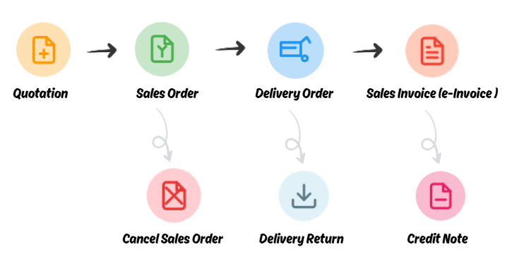 AutoCount Document Flow clearly maps the entire lifecycle of your transactions. By following the connecting arrows, users can instantly trace how documents move from one stage to another, ensuring full visibility and accurate tracking throughout the business process.