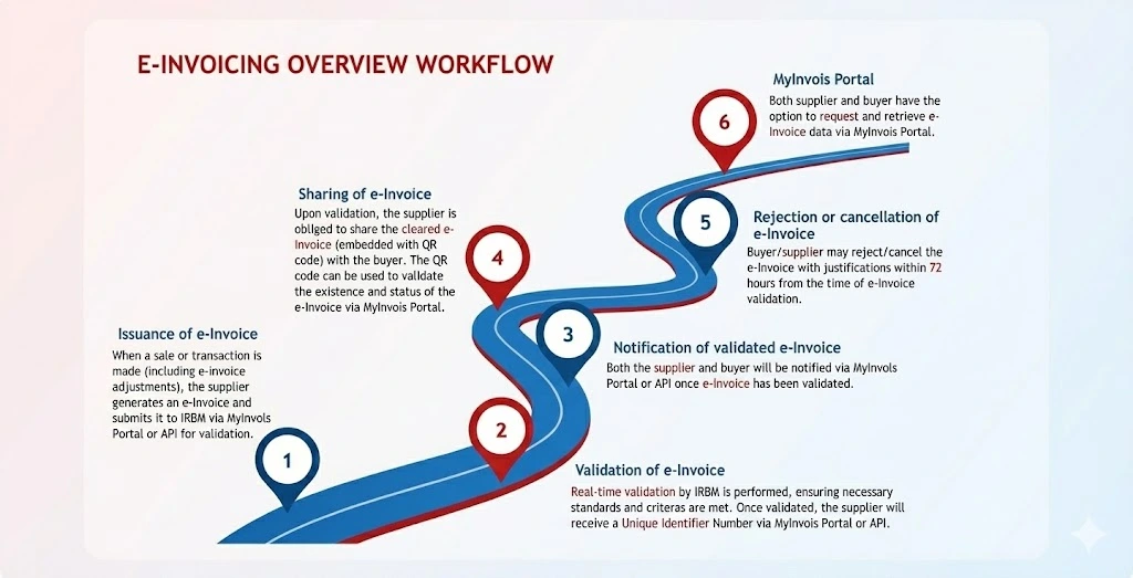 When a sale or transaction is made (including e-Invoice adjustments), the supplier generates an e-Invoice and submits it to IRBM via MyInvois Portal or API for validation.