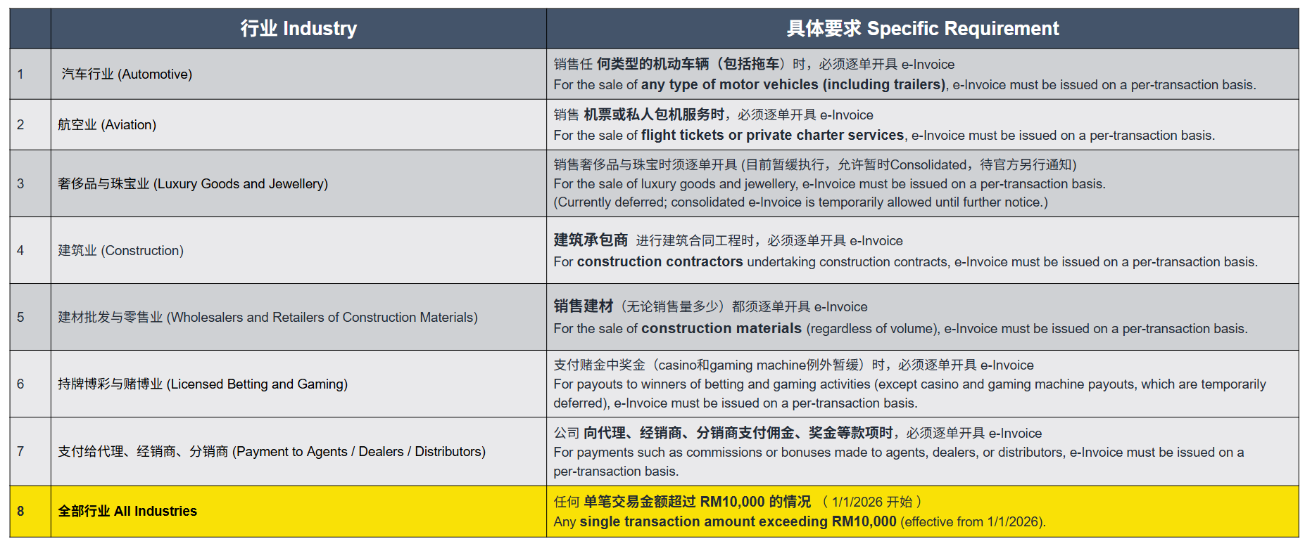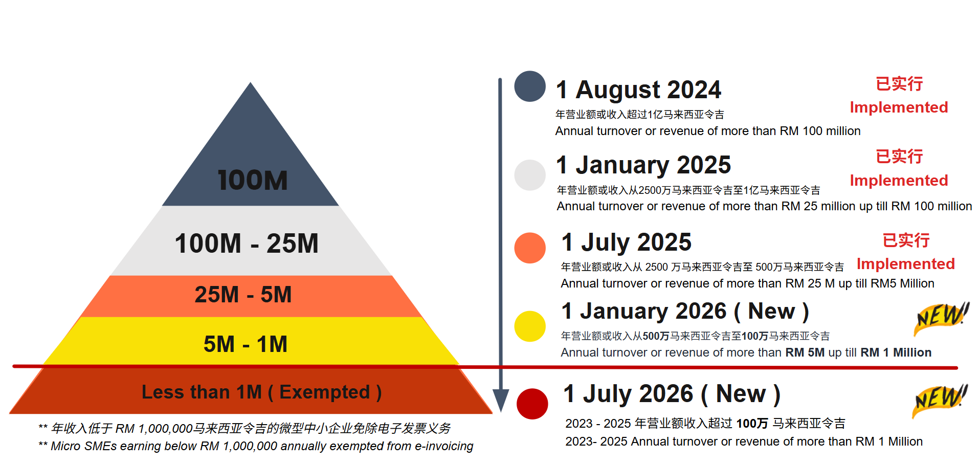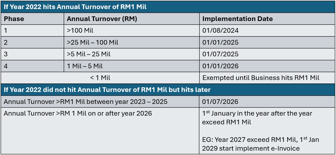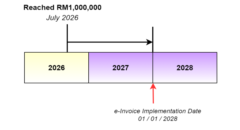 For new businesses or operations commencing from year 2026 onwards, the e-Invoice implementation date is 1 July 2026 or upon the operation commencement date. However, if the first year’s turnover or revenue is less than RM1,000,000, the e-Invoice implementation date would be 1 January in the second year following the year in which the total annual turnover or revenue reached RM1,000,000.