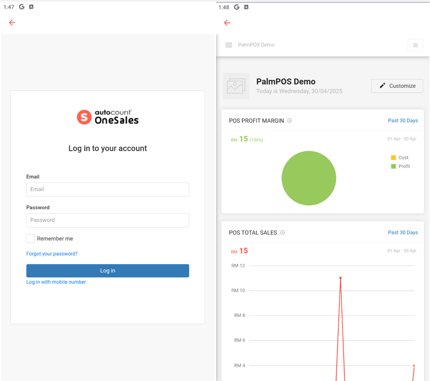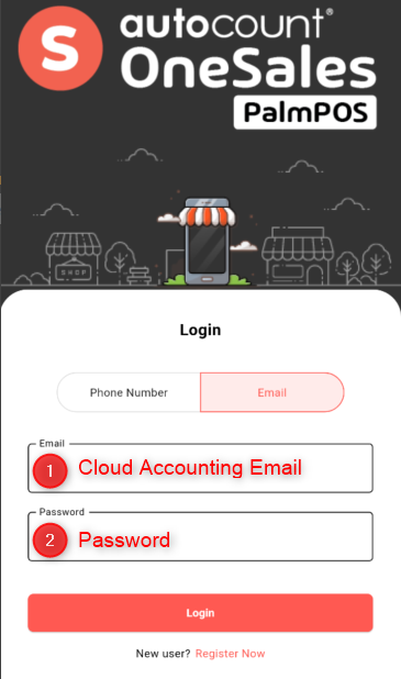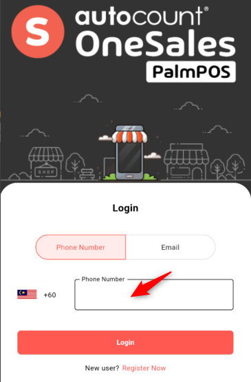 This guide shows you how to login to OneSales Backend in PalmPOS. You can login to OneSales Backend either from the URL (onesales.autocountcloud.com) or directly from the app.