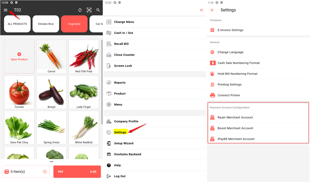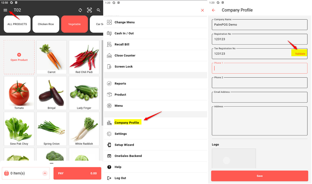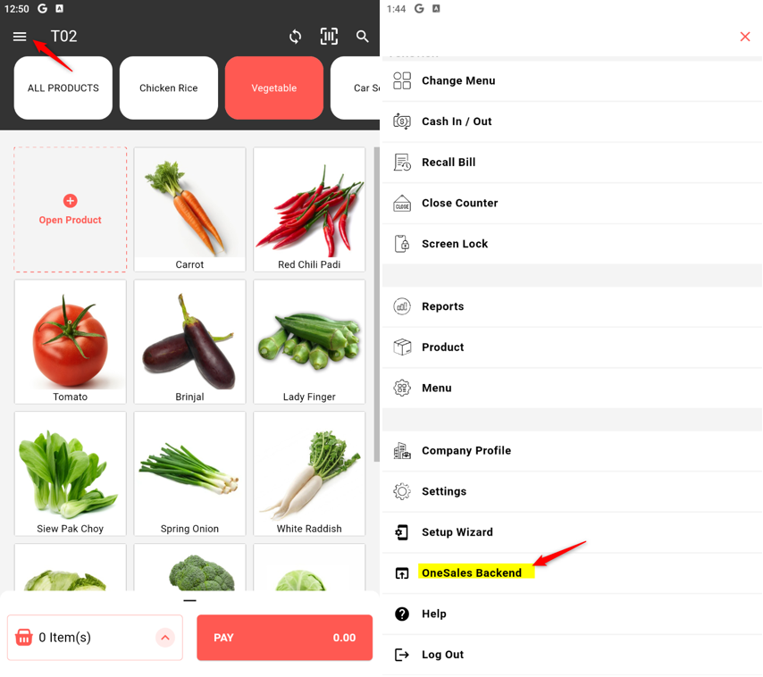 To login OneSales backend through PalmPOS, click on the “Menu” > “OneSales Backend”.
