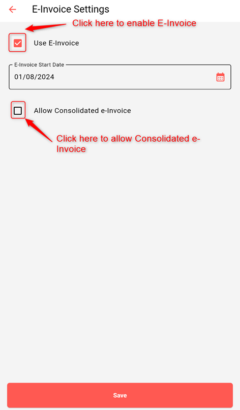 Tick the “Use E-Invoice” to enable E-Invoice. You may choose your e-Invoice start date. For consolidated e-Invoice, you can tick the “Allow Consolidated e-Invoice” if you want to do Consolidated e-Invoice.