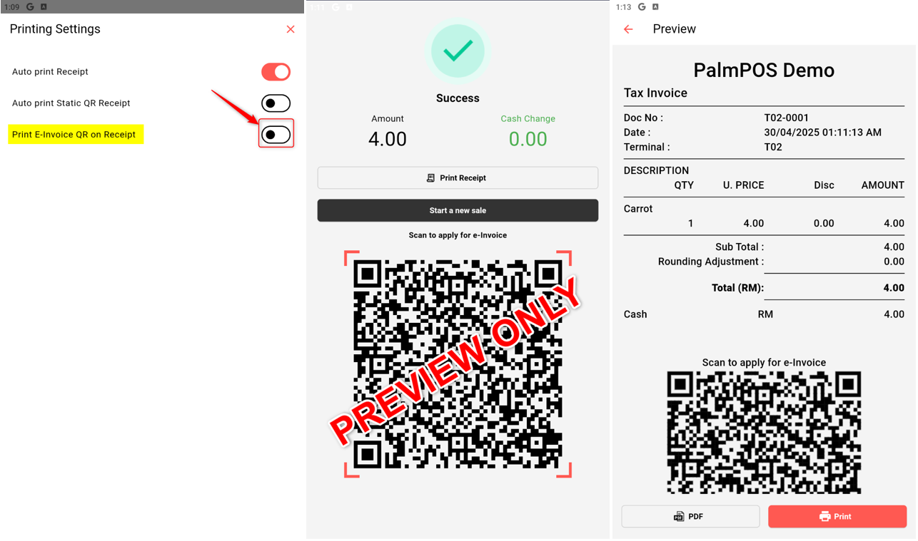 Enable the “Print E-Invoice QR on Receipt”, then the QR will show when the receipt printed.