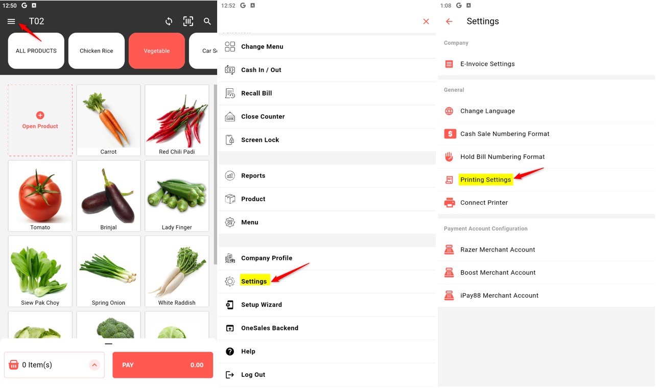 To show e-Invoice QR in receipt, click on the “Menu” > “Settings” > “Printing Settings”.