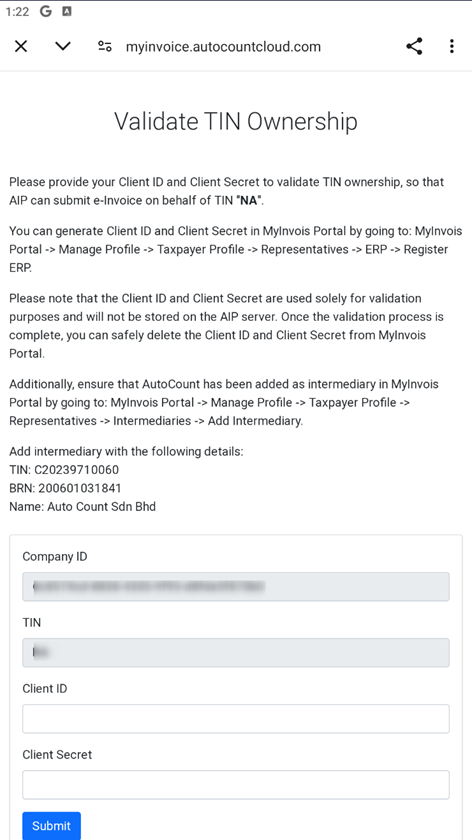 To Validate TIN Ownership, please provide your Client ID and Client Secret to validate TIN ownership, so that AIP can submit e-Invoice on behalf of TIN "NA".