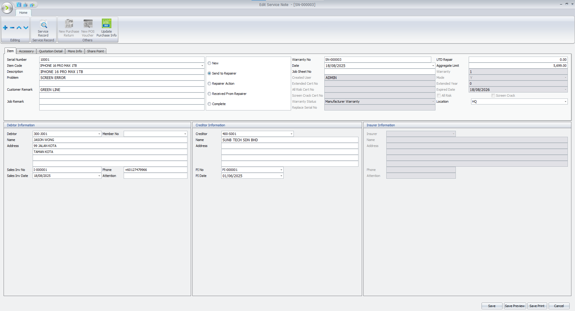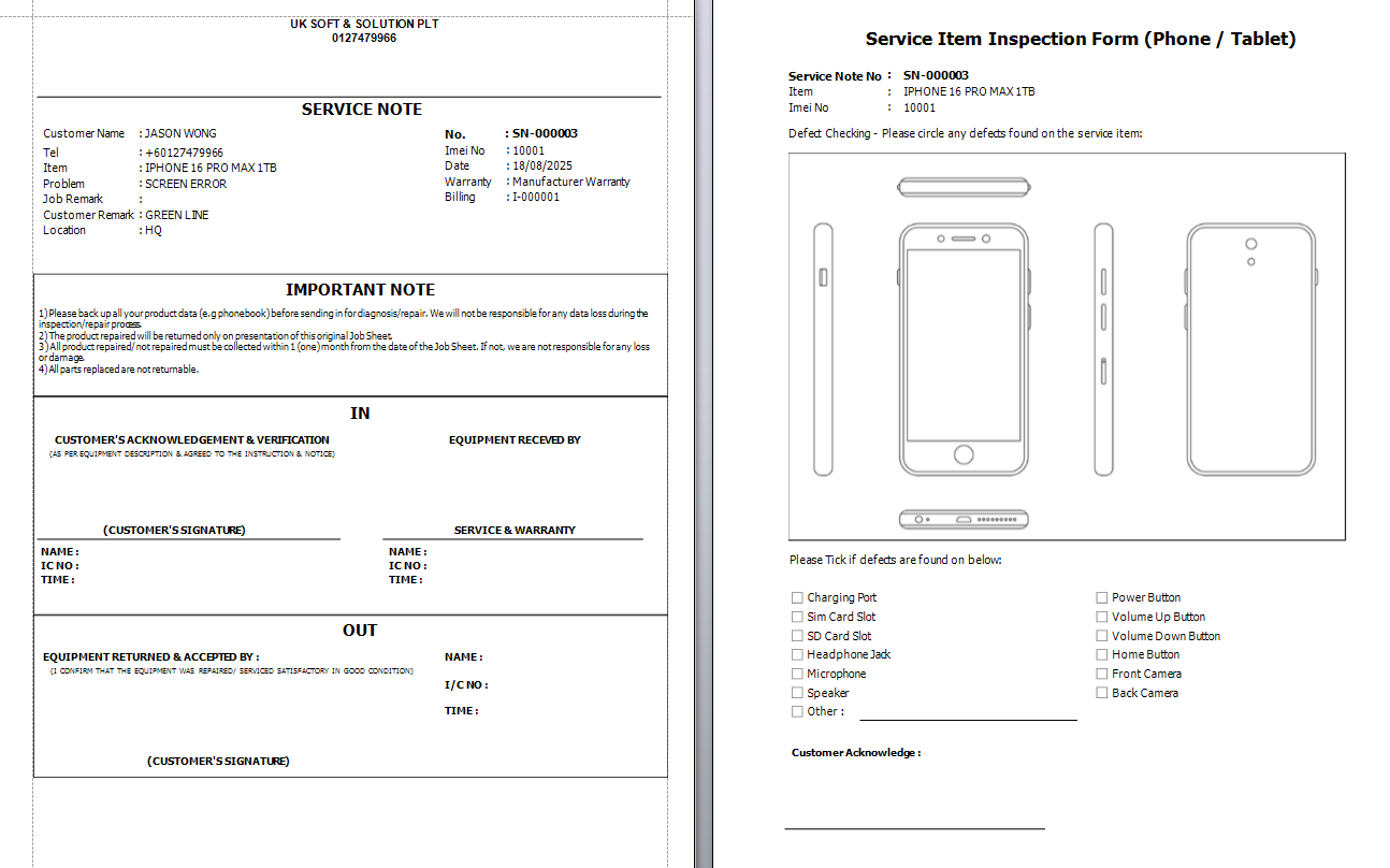 The Service Note function is a comprehensive and highly efficient tool designed to help you effortlessly manage every customer's repair and warranty service. Through an intuitive interface, it digitizes the complex repair process, ensuring that every record is accurate and flawless.