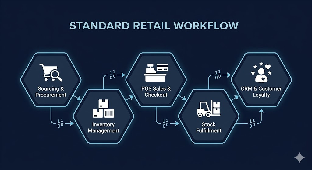 The visual core of retail is balancing immediate storefront sales with efficient inventory management. This workflow is a seamless loop from product sourcing to the crucial point of sale (POS) and continuous customer engagement.
