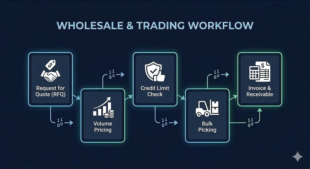 The wholesale workflow is built on volume and process rigor. The visual flow emphasizes high-volume logistics and automated credit checks—critical for large-scale B2B trading.