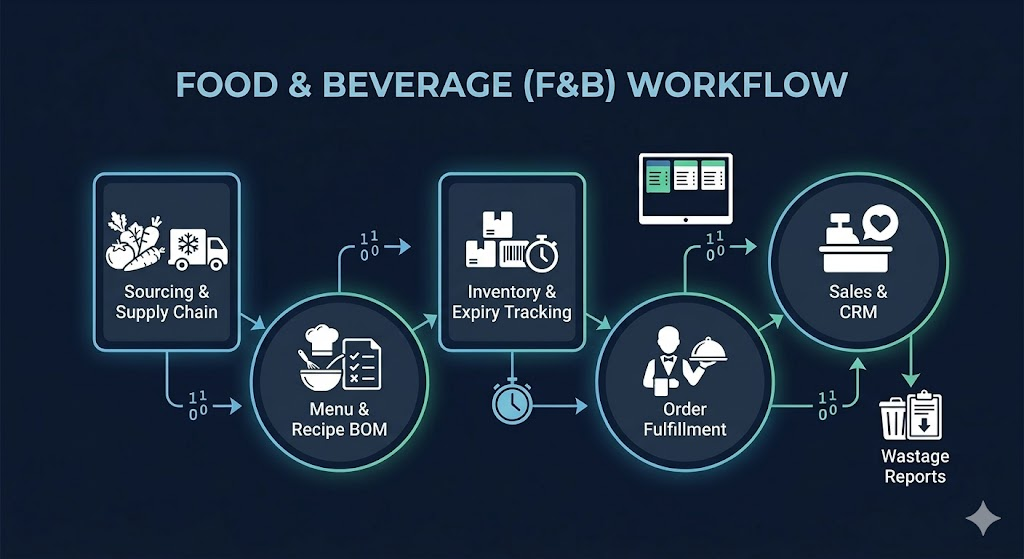 The F&B workflow visualizes the race against perishable inventory. It centers on the "Menu & Recipe BOM" phase, which is crucial for managing consistent costs and reducing wastage.
