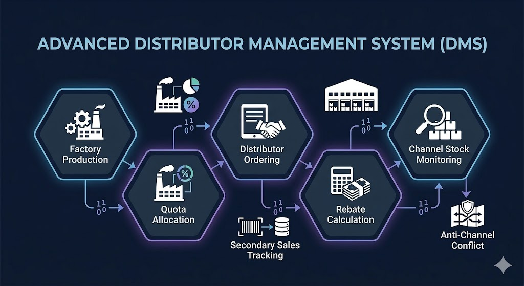DMS is about network control. The visual flow emphasizes the hierarchy, moving from factory planning to quota allocation and the critical monitoring of secondary sales (sell-out data) from distributors to retailers.