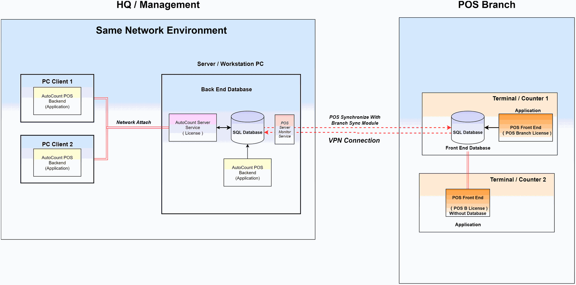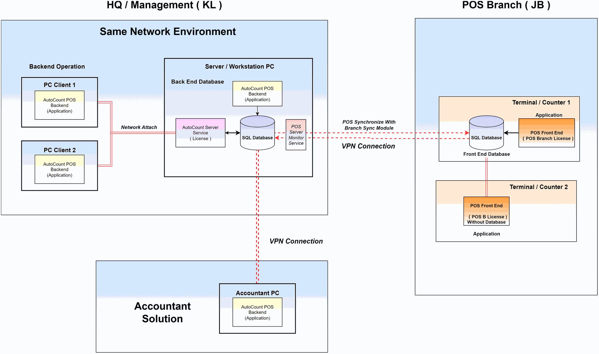 AutoCount 系统支持多种网络连接方式,用户可以根据自身需求通过本地网络 (Local Network)、WiFi 或 虚拟私人网络 (VPN) 进行连接,以确保高效、安全的业务流程。